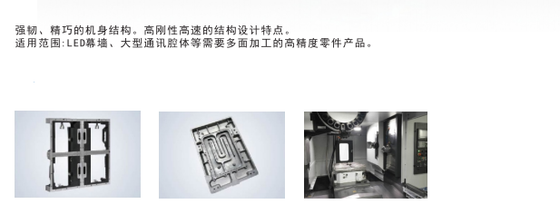 強(qiáng)韌、精巧的機(jī)身結(jié)構(gòu),高剛性高速的結(jié)構(gòu)設(shè)計(jì)特點(diǎn)。機(jī)床功能高度自動(dòng)化配置雙主軸和液壓回轉(zhuǎn)臺(tái),實(shí)現(xiàn)五軸控制,一次裝夾即可完成五面加工。適用于:LED幕墻、大型通訊腔體等需要多面加工的高精度零件產(chǎn)品。